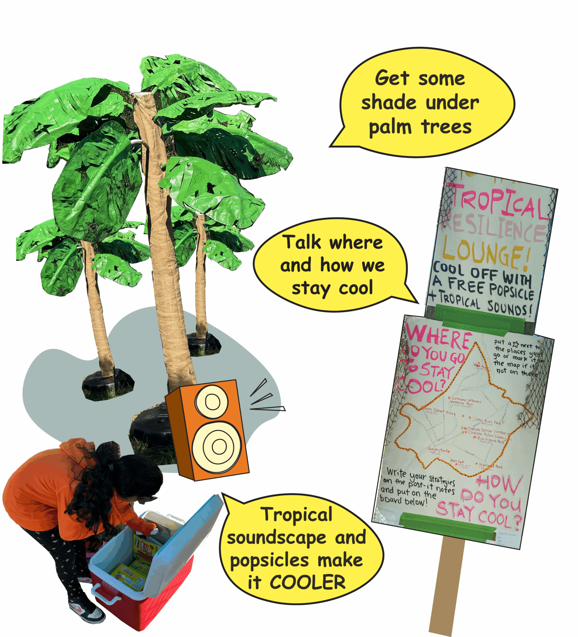 Tropical Resilience Lounge is a playful, tropical-themed pop-up designed to spark meaningful community dialogue about heat resilience. Framed as an oasis of joy and reflection, it invites people to step into a welcoming, multi-sensory environment where they can connect, share stories and perspectives, and exchange ideas and information about staying cool together. The package includes: