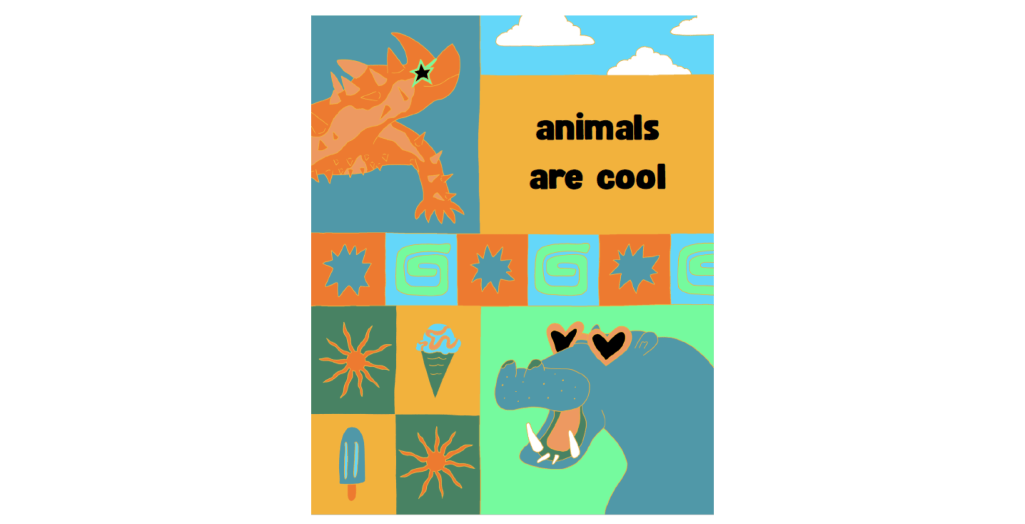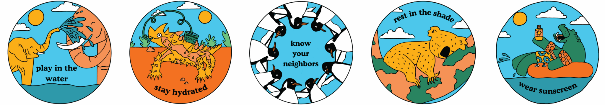 “Animals Are Cool” is an engagement tool to work with elementary aged children to create resources that can share knowledge with their similar aged peers. It draws on the artists’ combined experience as educators and artists and engages youth as important conveyors of information to their community, and as one of the groups most highly critically impacted by heat. By learning how animals deal with heat in unique ways with illustrations and poems, kids are inspired to think about how they stay cool and keep their communities safe in summer. This package includes: