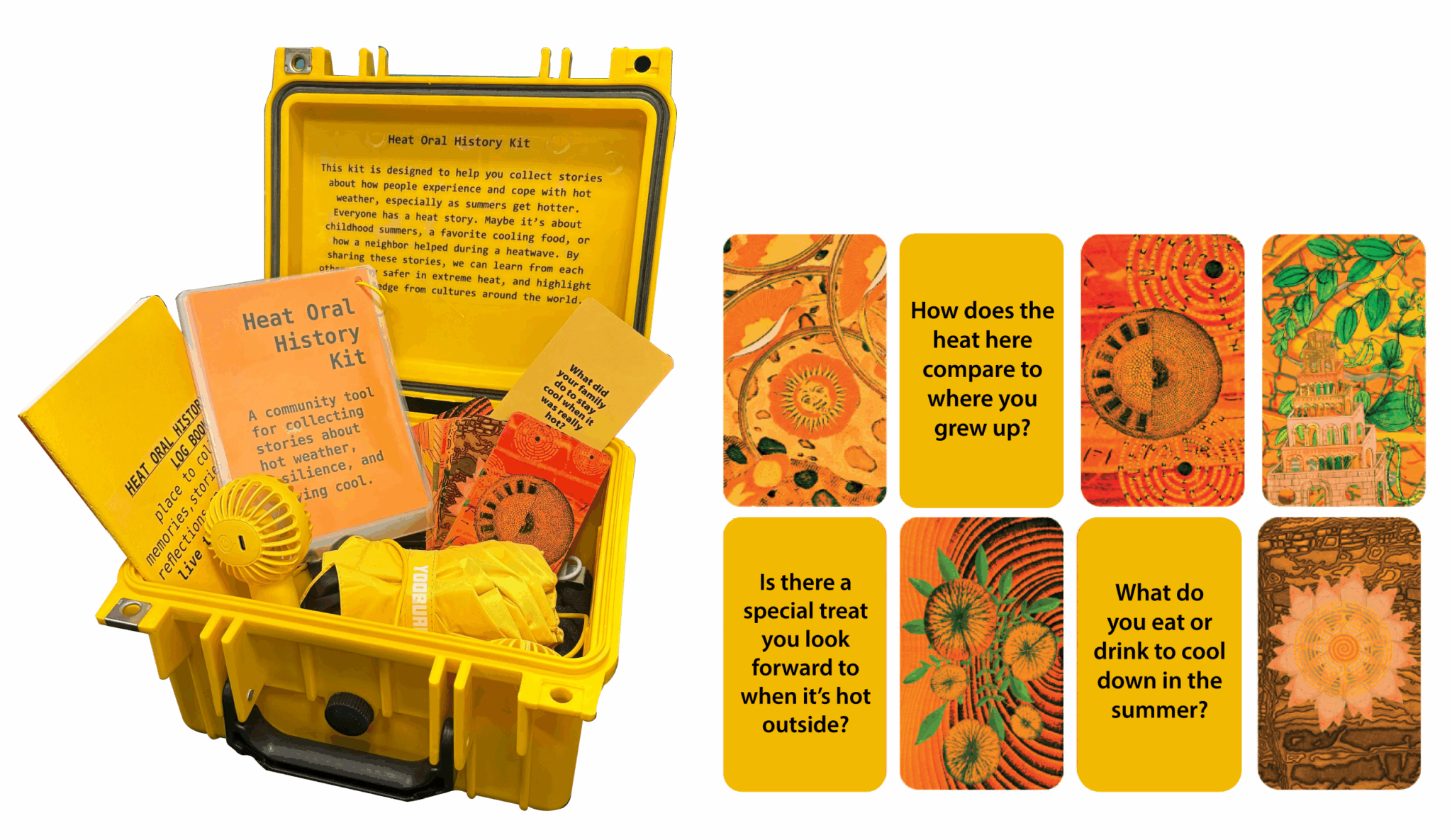Each kit includes a deck of heat cards with conversation-starting questions, an oral history guidebook, postcards and stickers, a Mini Fan to stay cool during interviews.